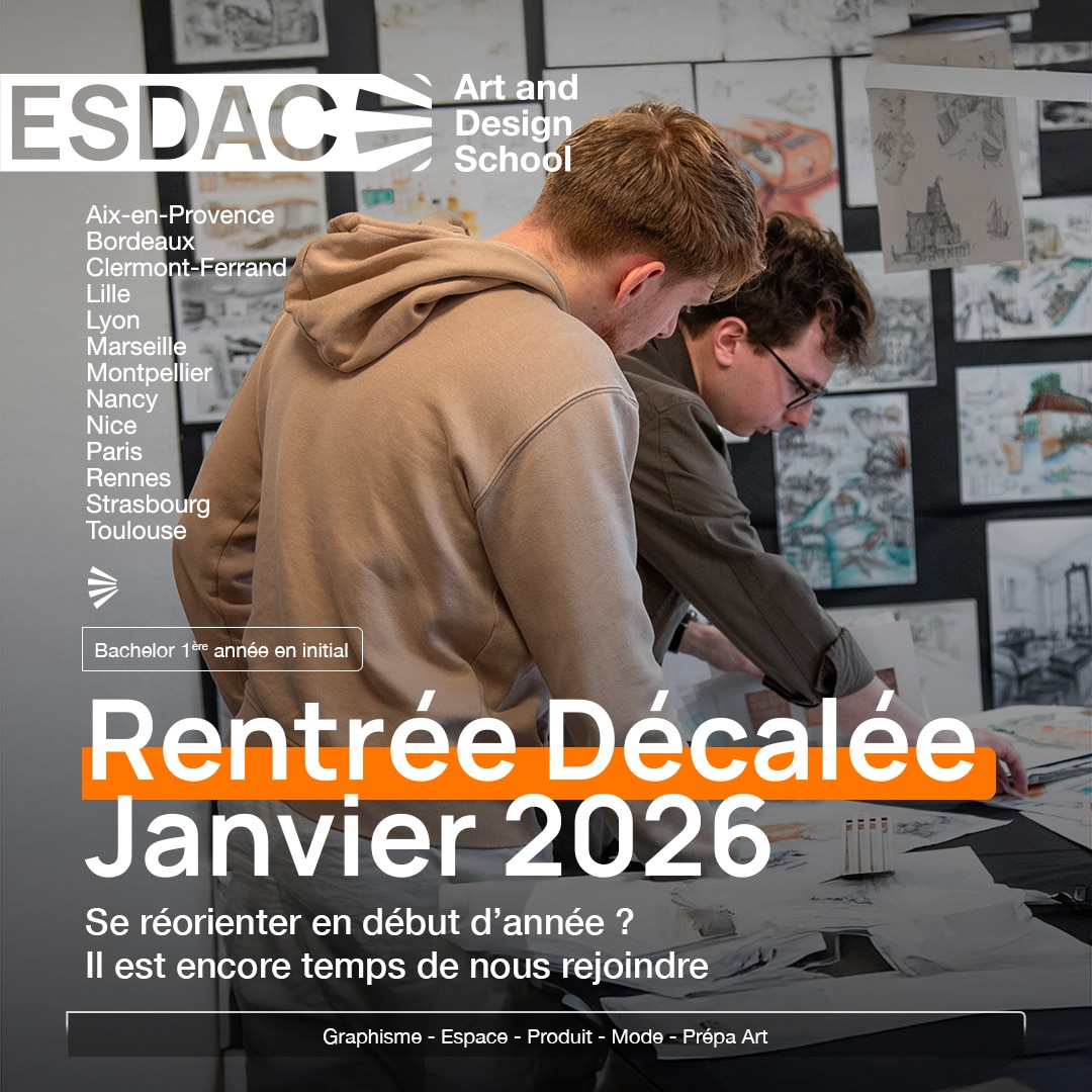 *Tarif valable pour toute inscription finalisée et complète effectuée entre le 20/10/2025 et le 31/01/2026 inclus, réservé aux étudiants souhaitant intégrer ESDAC, École Supérieure d'Art et de Design, en 1ère année du Bachelor Art et Design, Design Graphique & Design Produit, Design Espace & Design Produit et Design Mode & Design Produit en formation initiale pour la rentrée de janvier 2026. Ce tarif comprend les frais de scolarité et de dossier pour cette rentrée académique 2025/2026.